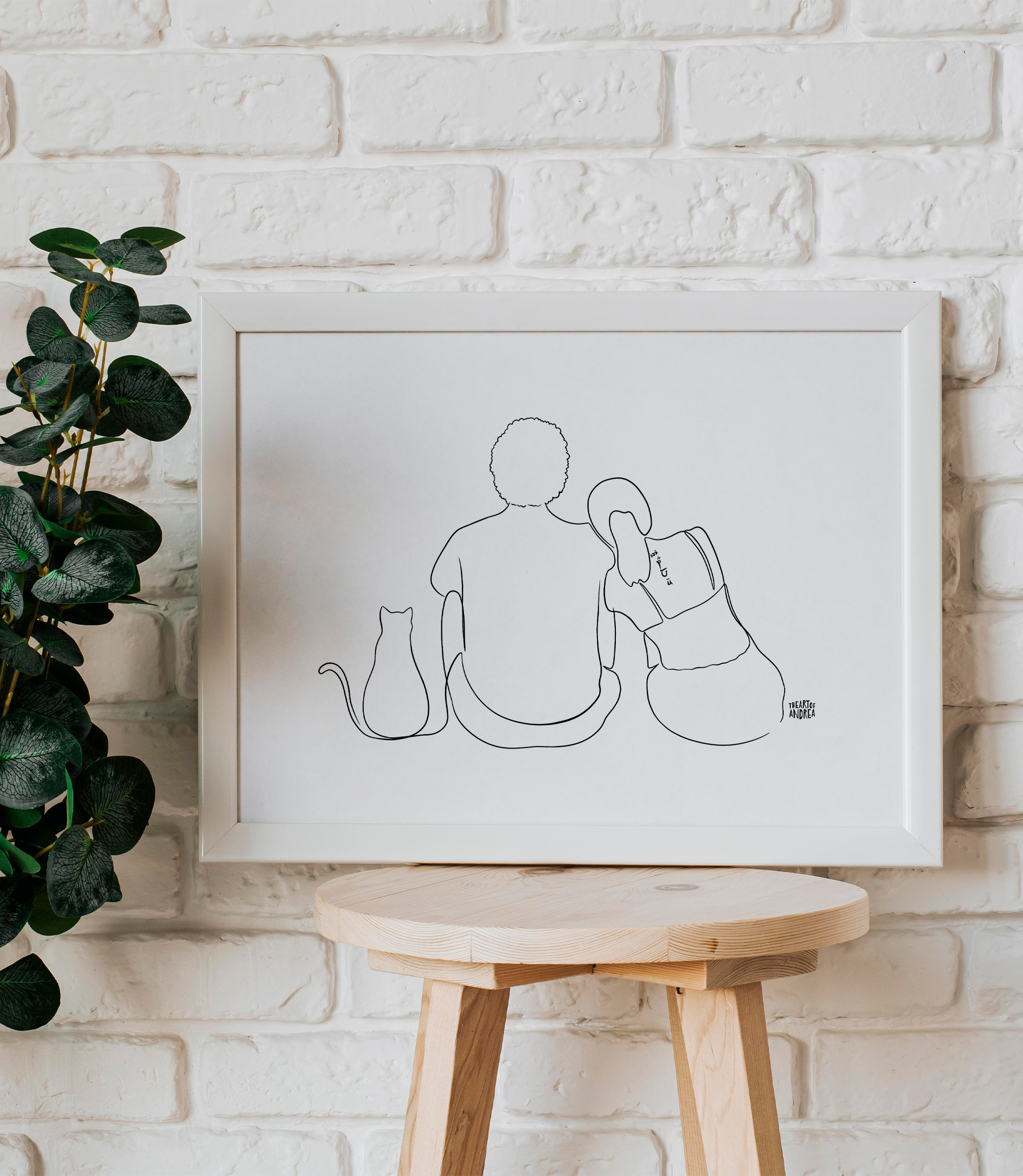 Ilustración creada a partir de trazos y líneas, con ojos rasgados y un estilo limpio y cuidado. Cada pieza se realiza con mimo, prestando atención a cada detalle para que el resultado sea especial y único.